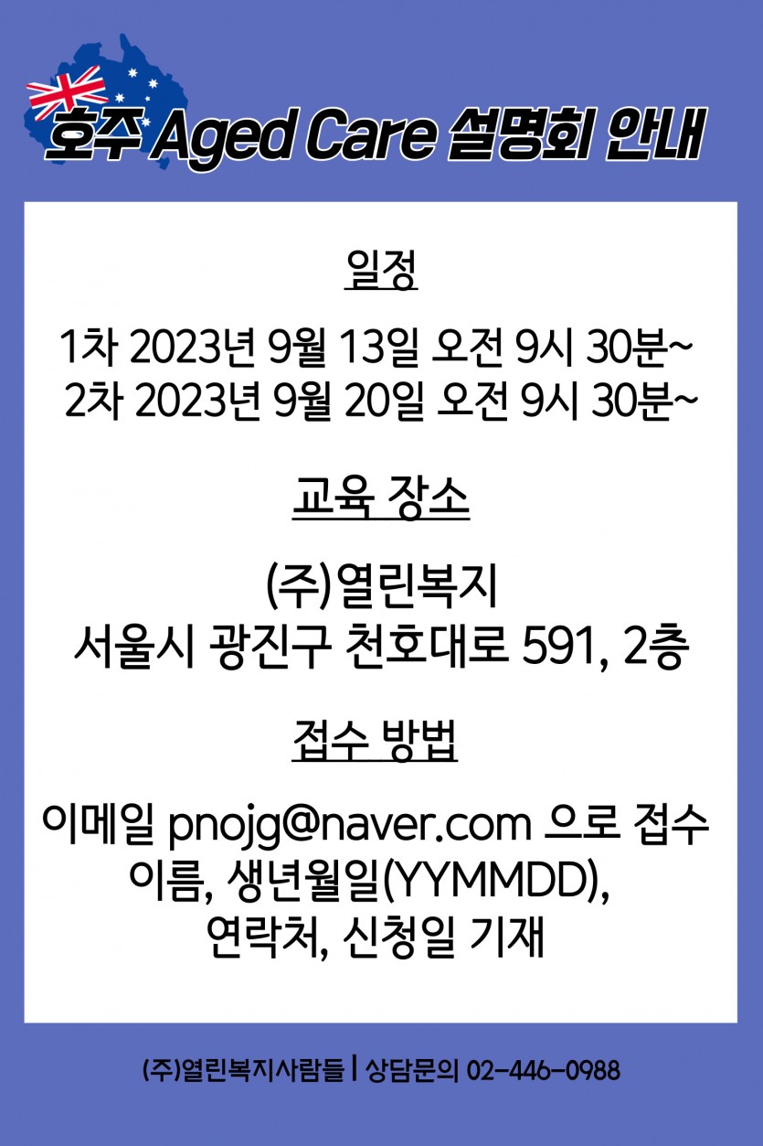 1. 국내4개월(직무와 영어교육)+호주2개월 후 cert3 자격증 취득 후 Aged Care 분야의 취업 가능