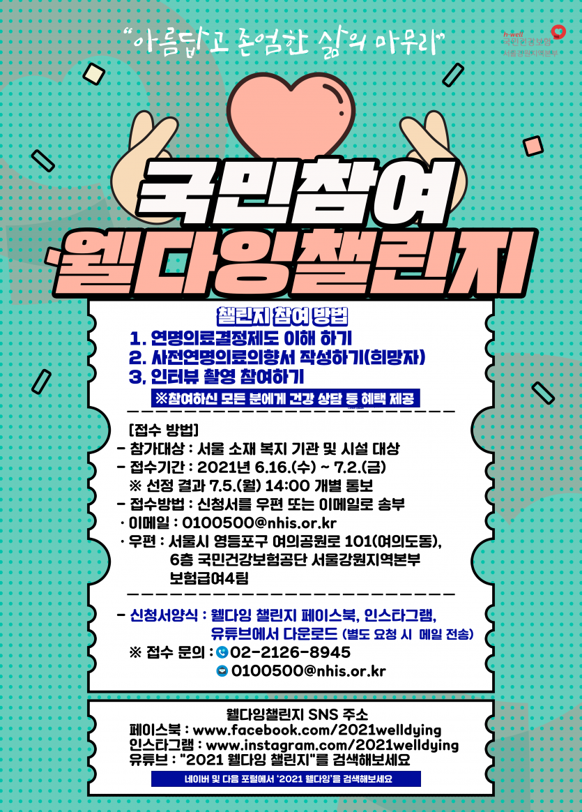 국민건강보험공단 서울강원지역본부에서는 연명의료결정제도에 대한 인식 개선과 웰다잉 문화조성을 위한 ‘국민참여 웰다잉 챌린지’를 추진하고자 하오니 참여 협조 요청드립니다.