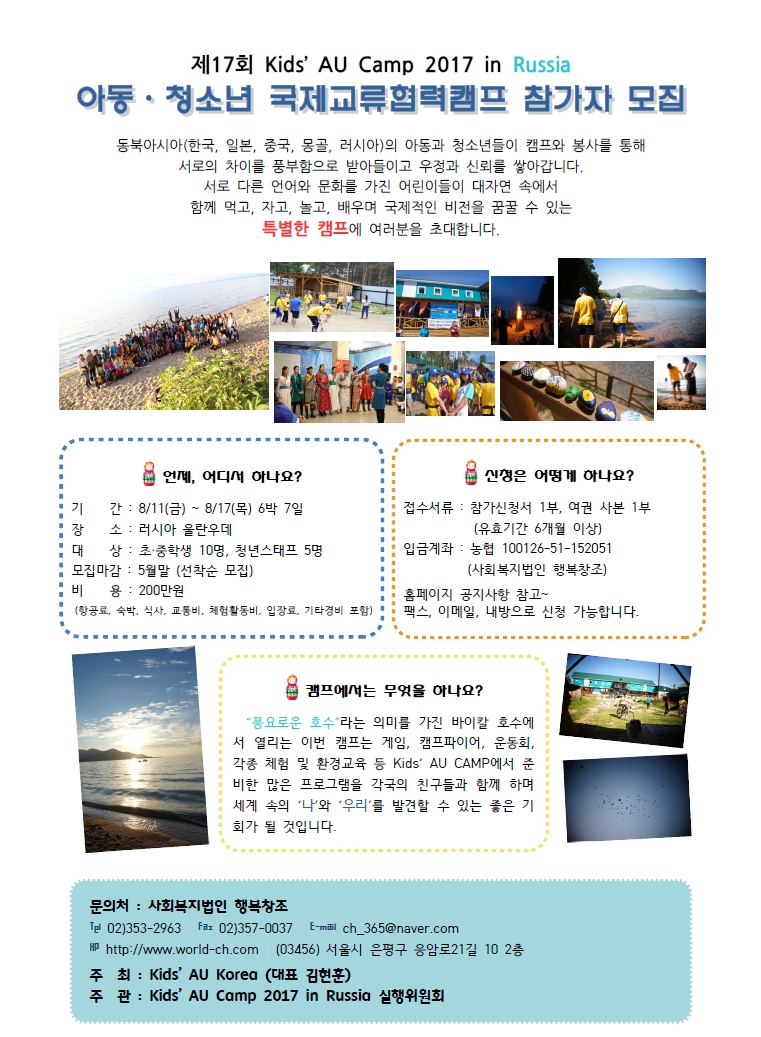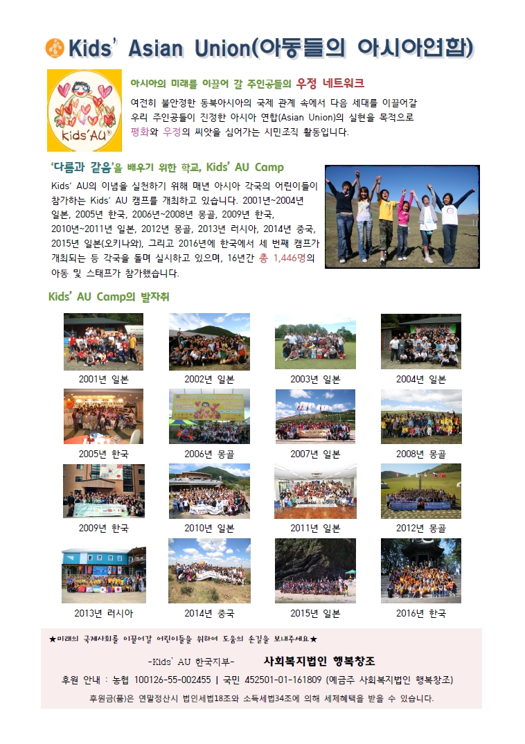 <P class=0 style="TEXT-AUTOSPACE: ; mso-pagination: none; mso-padding-alt: 0.0pt 0.0pt 0.0pt 0.0pt"><SPAN lang=EN-US style="FONT-FAMILY: 함초롬바탕; LETTER-SPACING: 0pt; mso-font-width: 100%; mso-text-raise: 0.0pt">Kids' AU Camp</SPAN><SPAN style="mso-fareast-font-family: 함초롬바탕">는 동북아시아</SPAN><SPAN lang=EN-US style="FONT-FAMILY: 함초롬바탕; LETTER-SPACING: 0pt; mso-font-width: 100%; mso-text-raise: 0.0pt">(</SPAN><SPAN style="mso-fareast-font-family: 함초롬바탕">한국</SPAN><SPAN lang=EN-US style="FONT-FAMILY: 함초롬바탕; LETTER-SPACING: 0pt; mso-font-width: 100%; mso-text-raise: 0.0pt">, </SPAN><SPAN style="mso-fareast-font-family: 함초롬바탕">일본</SPAN><SPAN lang=EN-US style="FONT-FAMILY: 함초롬바탕; LETTER-SPACING: 0pt; mso-font-width: 100%; mso-text-raise: 0.0pt">, </SPAN><SPAN style="mso-fareast-font-family: 함초롬바탕">중국</SPAN><SPAN lang=EN-US style="FONT-FAMILY: 함초롬바탕; LETTER-SPACING: 0pt; mso-font-width: 100%; mso-text-raise: 0.0pt">, </SPAN><SPAN style="mso-fareast-font-family: 함초롬바탕">몽골</SPAN><SPAN lang=EN-US style="FONT-FAMILY: 함초롬바탕; LETTER-SPACING: 0pt; mso-font-width: 100%; mso-text-raise: 0.0pt">, </SPAN><SPAN style="mso-fareast-font-family: 함초롬바탕">러시아</SPAN><SPAN lang=EN-US style="FONT-FAMILY: 함초롬바탕; LETTER-SPACING: 0pt; mso-font-width: 100%; mso-text-raise: 0.0pt">)</SPAN><SPAN style="mso-fareast-font-family: 함초롬바탕">의 아동</SPAN><SPAN lang=EN-US style="FONT-FAMILY: 함초롬바탕; LETTER-SPACING: 0pt; mso-font-width: 100%; mso-text-raise: 0.0pt">·</SPAN><SPAN style="mso-fareast-font-family: 함초롬바탕">청소년들이 함께 먹고</SPAN><SPAN lang=EN-US style="FONT-FAMILY: 함초롬바탕; LETTER-SPACING: 0pt; mso-font-width: 100%; mso-text-raise: 0.0pt">, </SPAN><SPAN style="mso-fareast-font-family: 함초롬바탕">놀고</SPAN><SPAN lang=EN-US style="FONT-FAMILY: 함초롬바탕; LETTER-SPACING: 0pt; mso-font-width: 100%; mso-text-raise: 0.0pt">, </SPAN><SPAN style="mso-fareast-font-family: 함초롬바탕">자고</SPAN><SPAN lang=EN-US style="FONT-FAMILY: 함초롬바탕; LETTER-SPACING: 0pt; mso-font-width: 100%; mso-text-raise: 0.0pt">, </SPAN><SPAN style="mso-fareast-font-family: 함초롬바탕">배우며 꿈을 키우는 특별한 캠프입니다</SPAN><SPAN lang=EN-US style="FONT-FAMILY: 함초롬바탕; LETTER-SPACING: 0pt; mso-font-width: 100%; mso-text-raise: 0.0pt">.</SPAN></P>