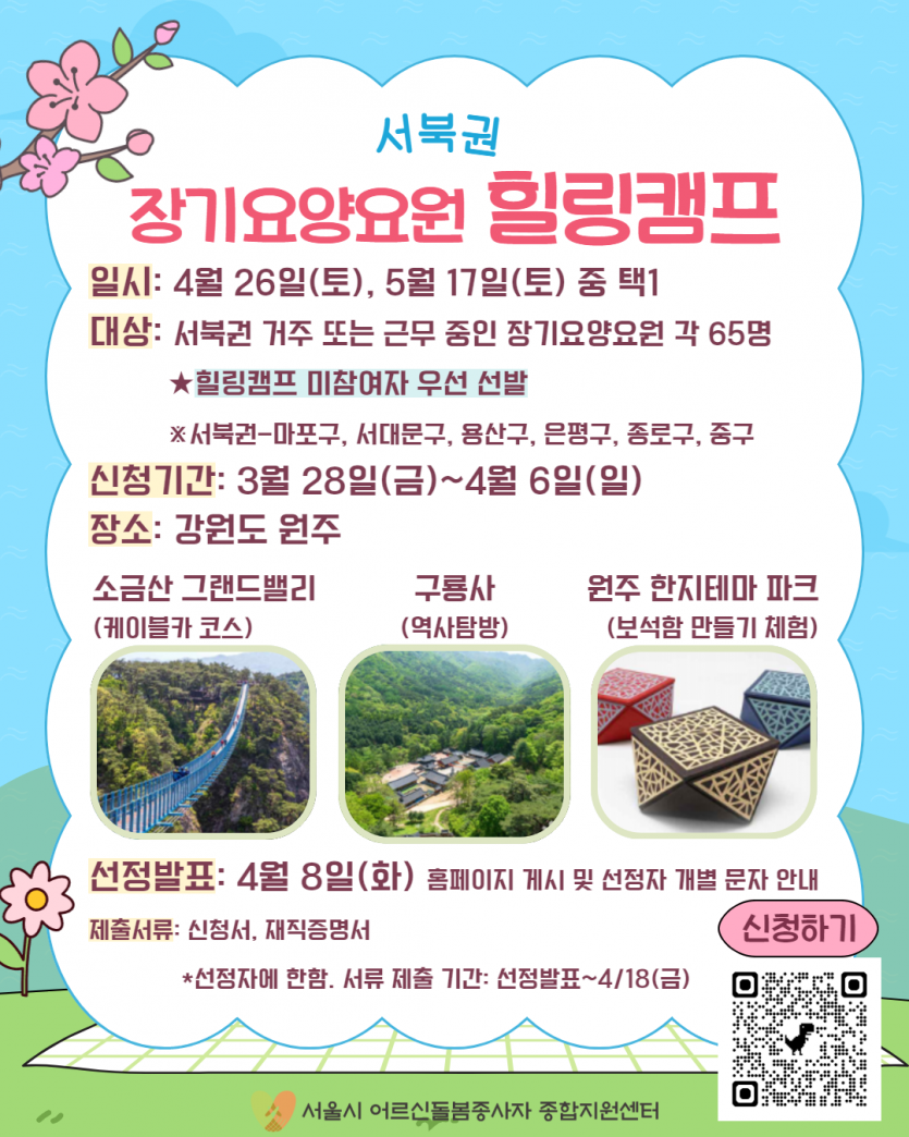 서울시 어르신돌봄종사자 종합지원센터에서는 서울시 제3기 장기요양요원 처우개선 종합계획의 일환으로 「2025년 장기요양요원 힐링캠프」를 진행합니다.