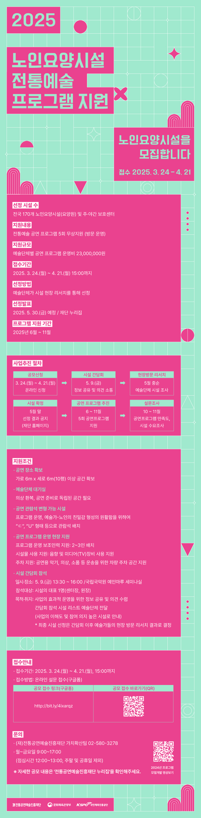 공문 2025 노인요양시설 전통예술 프로그램 지원 _노인요양시설_ 모집 공모 안내.pdf (81.2K)