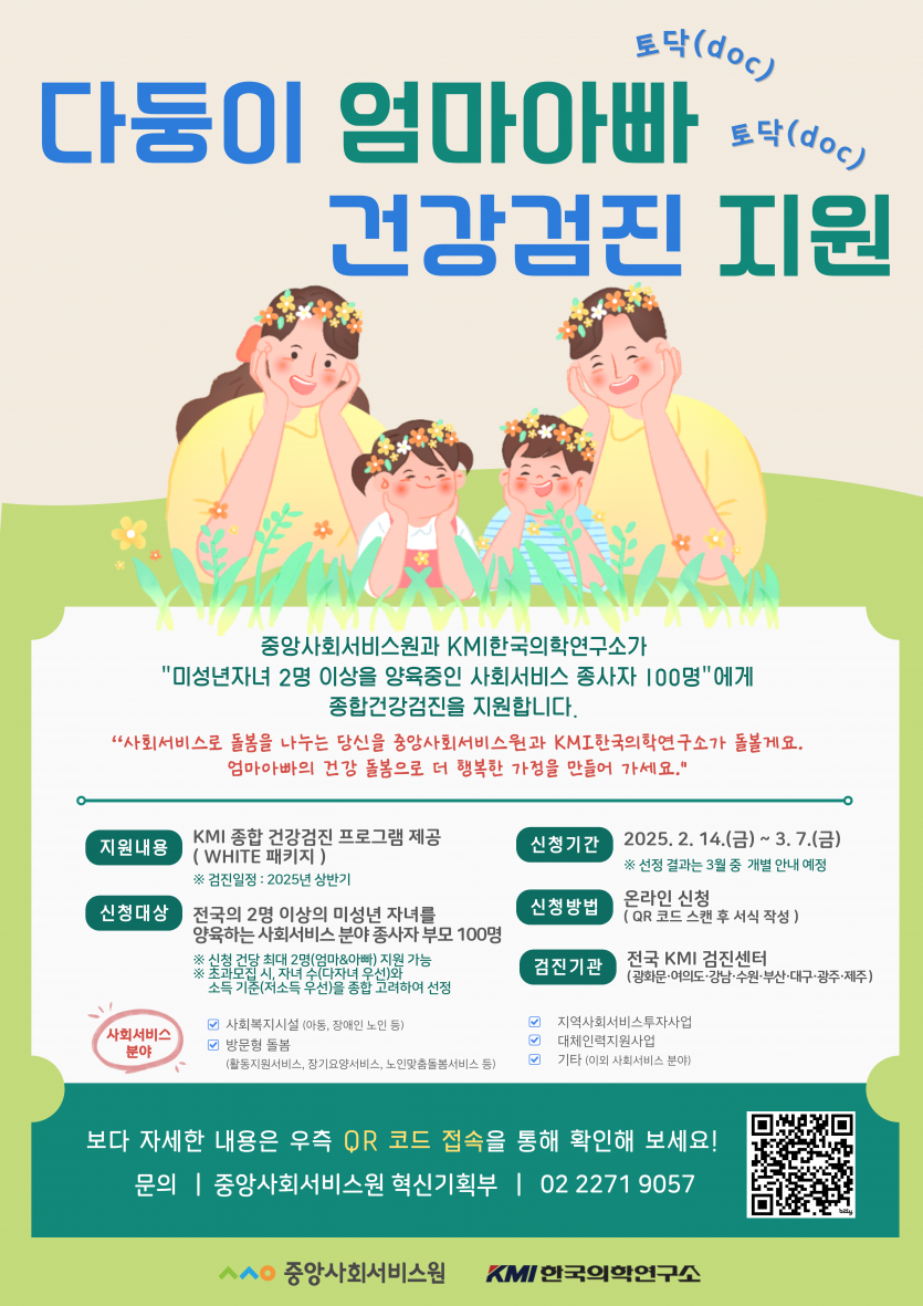 <중앙사회서비스원> 다자녀 양육 부모 건강검진 지원사업 참여자 모집 안내