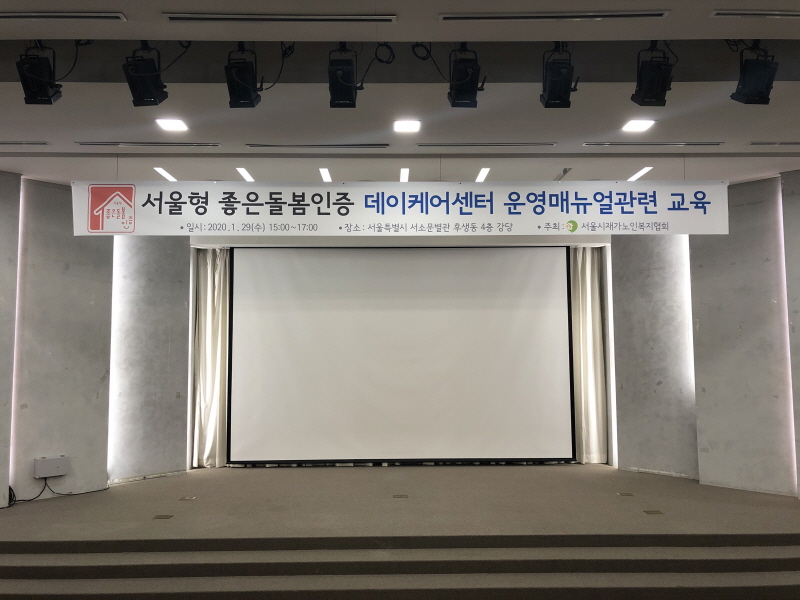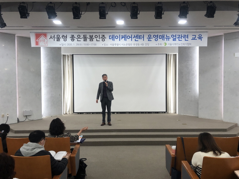 <P>*일시: 2020년 1월 29일(수) 15:00~17:00<BR>*장소: 서울특별시 서소문별관 후생동 4층 강당<BR>*참석인원: 187명<BR>*내용<BR> - 2020년 서울형 데이케어센터 운영지원계획 방향성 안내<BR> - 주야간보호시설 운영실태 조사 결과 및 의견수렴<BR> - 서울형 좋은돌봄인증 데이케어센터 운영매뉴얼 교육</P>