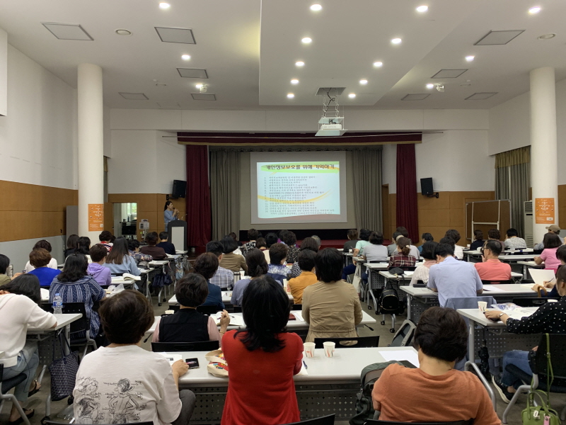 *일시 : 2019년 9월 4일(수) 09:00~18:00<BR>*장소 : 중부여성발전센터 2층 대강당<BR>*참석인원 : 77명<BR>*내용<BR> - 노인인권보호, 노인학대예방 지침<BR> - 성폭력, 성희롱 예방 및 대응지침<BR> - 치매예방 및 관리지침<BR> - 감염예방 및 관리지침<BR> - 근골격계 질환 예방 지침<BR> - 낙상예방 및 관리지침<BR> - 욕창예방 및 관리지침<BR> - 응급상황 대응지침<BR> - 종사자 윤리지침<BR> - 개인정보보호 지침