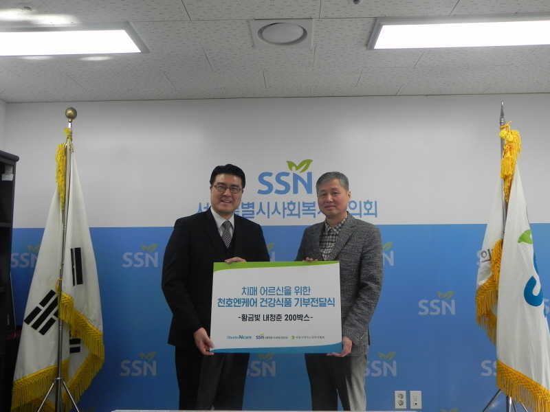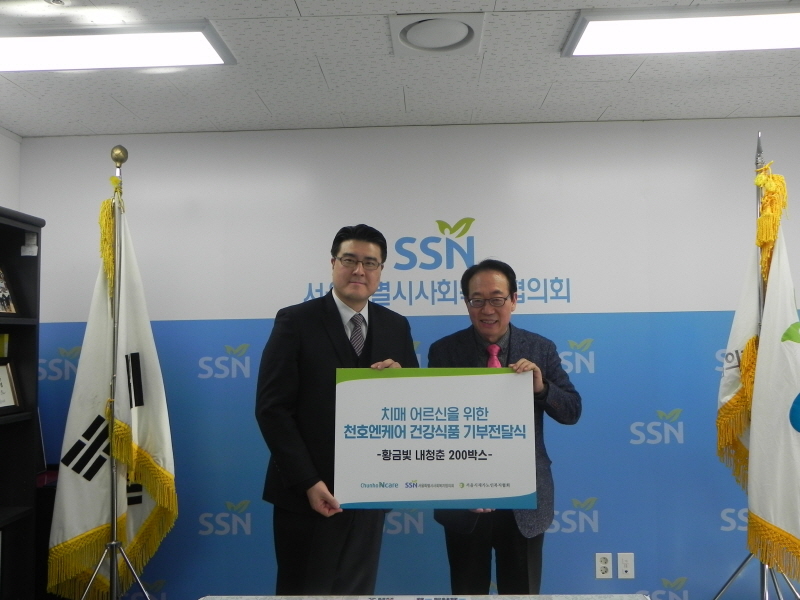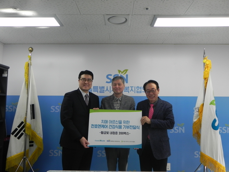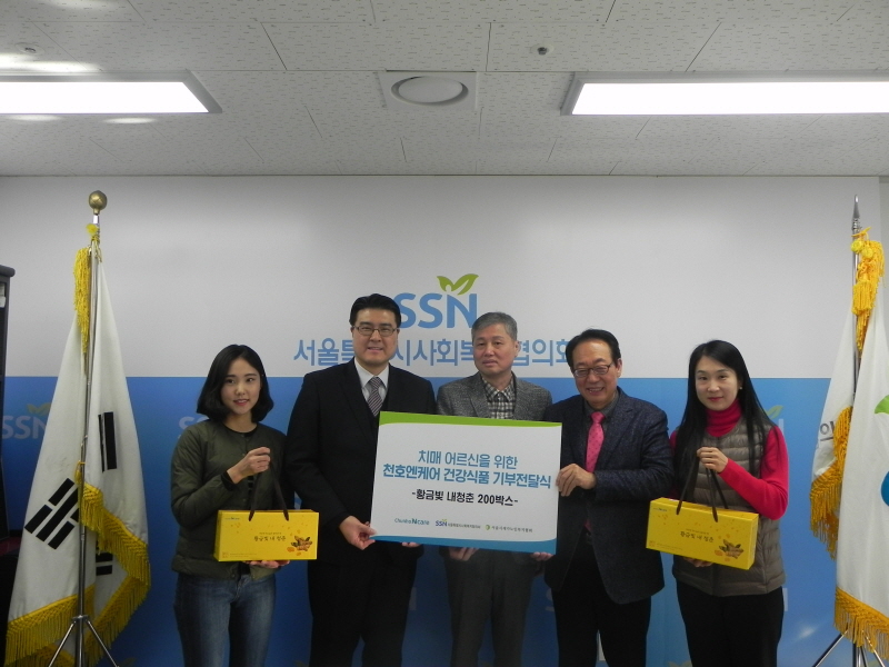 *일시 : 2018년 12월 27일(목) 14:30<BR>*장소 : 서울특별시사회복지협의회 회장실<BR>*참석인원 : 7명(업체 2명, 협의회 3명, 협회 2명)<BR>*내용 : 치매어르신을 위한 천호엔케어 건강식품 기부전달식(황금빛내청춘(울금즙) 200박스)