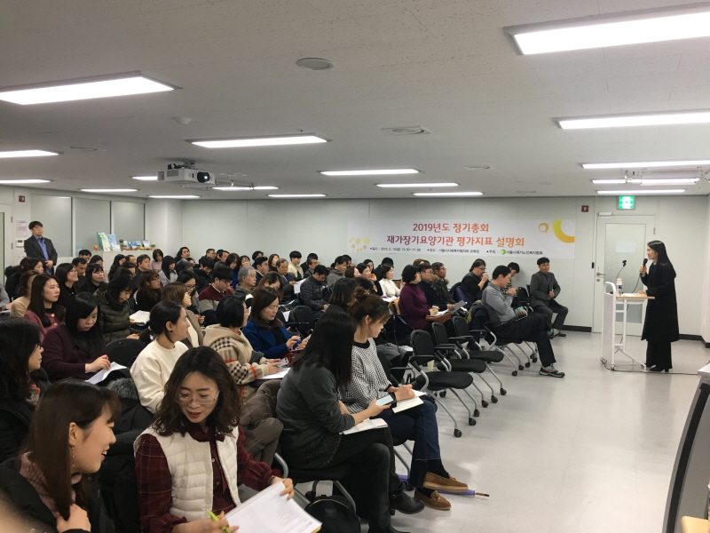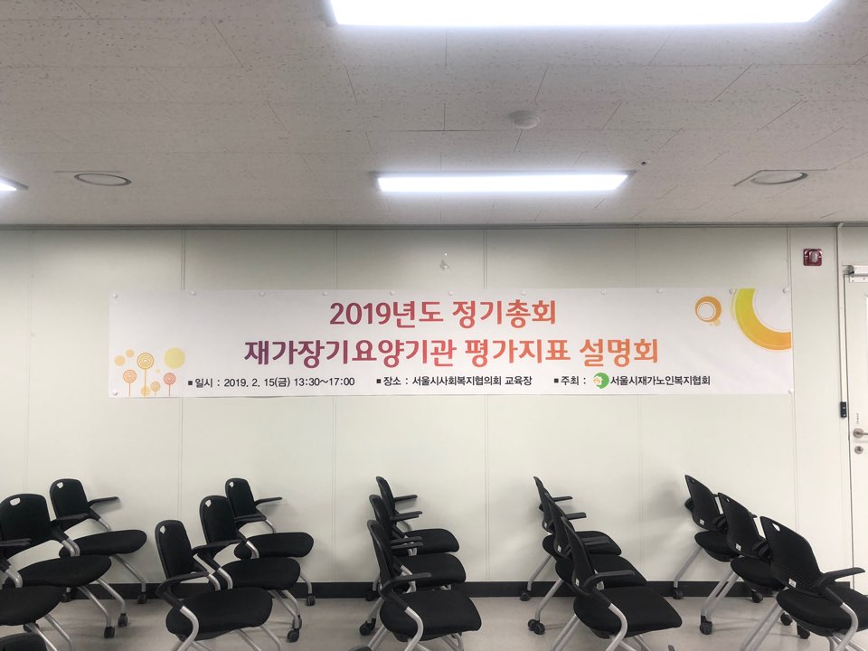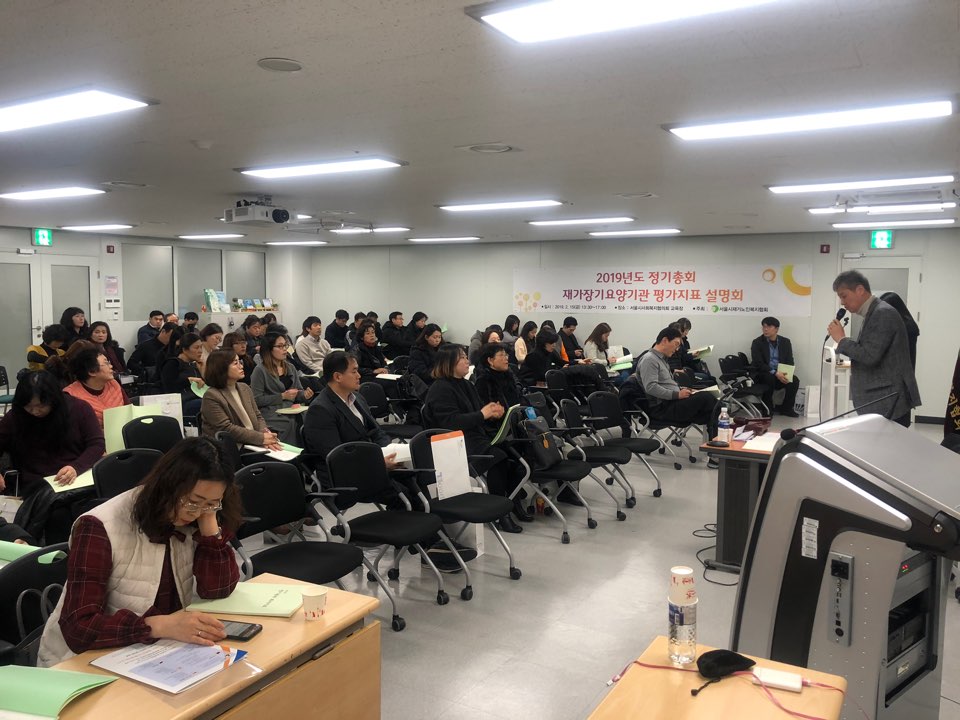 *일시 : 2019년 2월 15일(금) 16:00~16:30<BR> (*13:30~16:00 재가장기요양기관 평가지표 설명회)<BR>*장소 : 서울복지타운 5층 서울시사회복지협의회 교육장<BR>*참석인원 : 114명(참석회원 77명, 총회위임 48명)<BR>*안건<BR> - 2018년 사업실적 및 결산서 심의,의결<BR> - 2019년 사업계획 및 예산(안) 심의,의결<BR> - 기타사항
