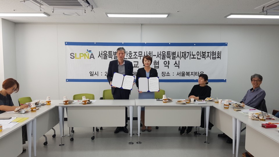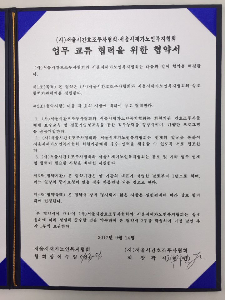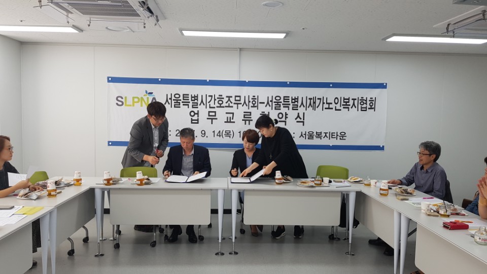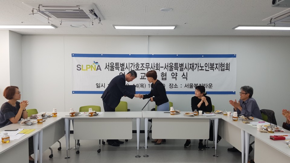 *일시 : 2017년 9월 14일(목) 16:00-17:30<BR>*장소 : 서울특별시사회복지협의회 대회의실<BR>*참석자 : 19명<BR>*내용<BR> - 서울특별시간호조무사회 업무협약식<BR> - 활동사항 보고<BR> - 논의사항