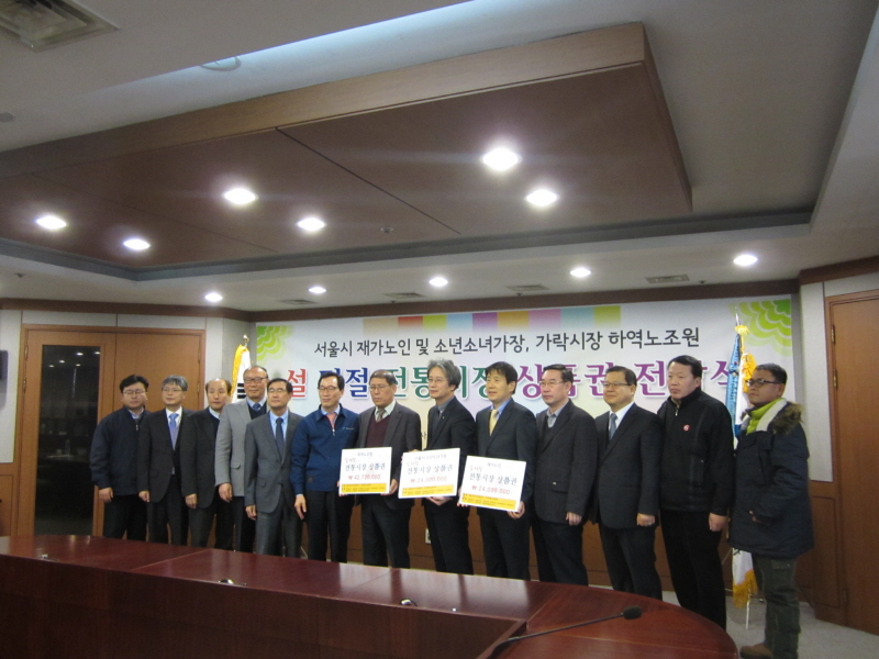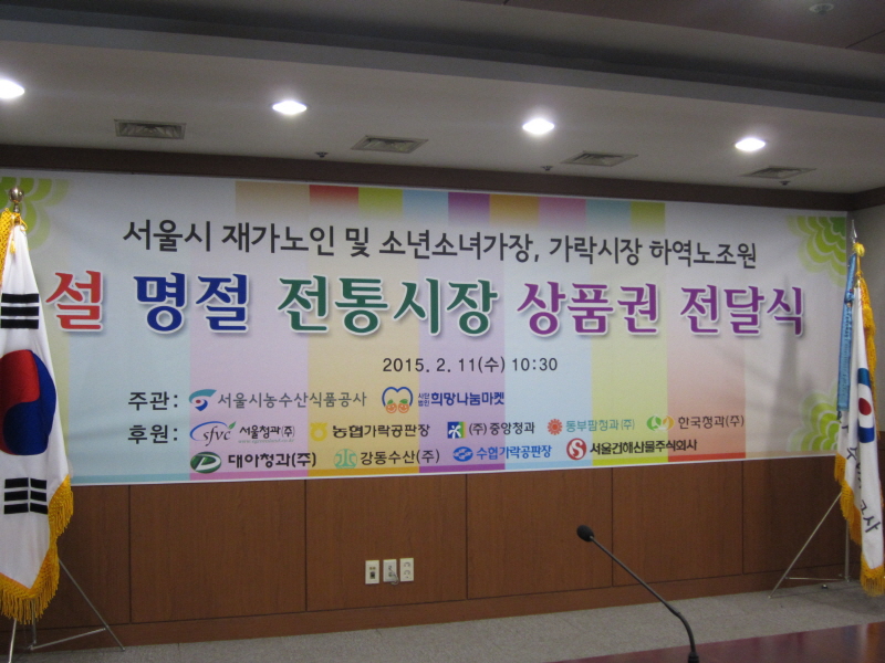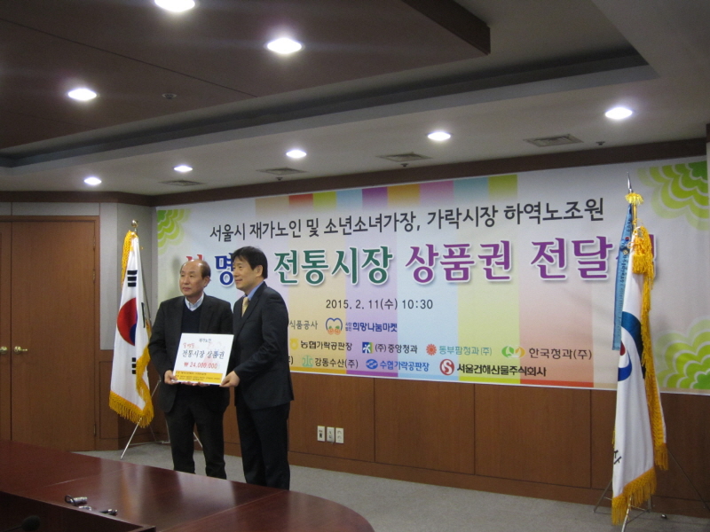 *일시 : 2015년 2월 11일(수) 10:30~11:00<BR>*장소 : 서울시농수산식품공사 5층 대회의실<BR>*내용 : 전통시장 상품권 24,000,000원 전달식 및 기념촬영