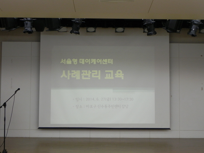 일시 : 2014. 6. 27(금) 13:30~17:30<BR>장소 : 마포구 신수동주민센터 강당<BR>참석인원 : 55명<BR>내용 <BR> - 서울형 데이케어센터 사례관리 이해(창천데이케어센터 강민석센터장)<BR> - 서울형 데이케어센터 사례관리 실제(궁동데이케어센터 심우철센터장)