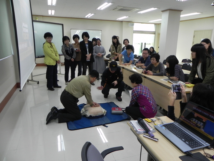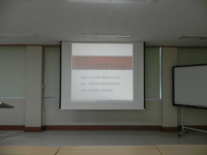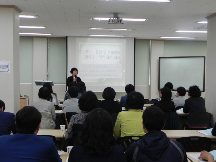 일시 : 2013. 10. 14(월) 10:00-17:00<BR>장소 : 서울특별시사회복지협의회 강당<BR>참석자 : 50명<BR>내용<BR> - 응급상황대응<BR> - 개인정보보호, 윤리 및 성희롱예방<BR> - 노인학대 폭력에 대한 예방 및 대응<BR> - 치매예방 및 관리<BR> - 욕창예방 및 관리, 낙상예방<BR> - 근골격계 질환 및 감염 예방<BR>