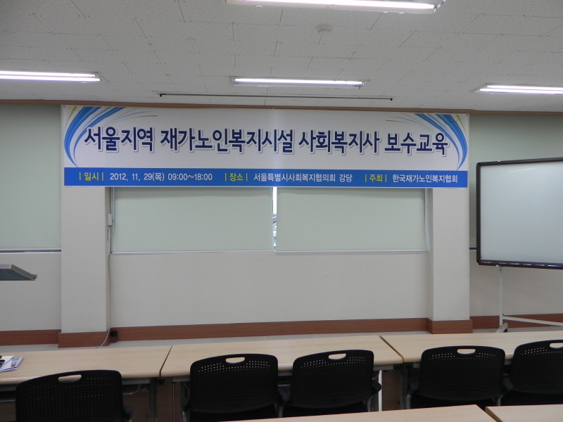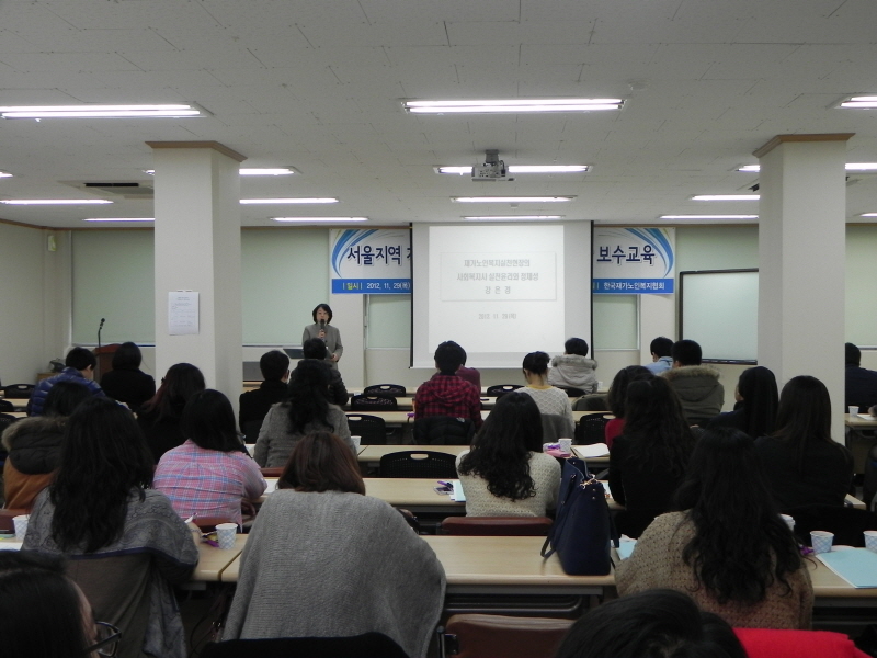 일시 : 2012. 11. 29(목) 09:00~18:00<BR>장소 : 서울특별시사회복지협의회 강당<BR>인원 : 54명<BR>내용 <BR> - 재가노인복지 전문직과 윤리<BR> (강남구립 논현노인종합복지관 강은경 관장)<BR> - 재가노인복지시설 재정관리<BR> (반포종합사회복지관 김한욱 관장)<BR> - 클라이언트와 관계형성 및 의사소통기술<BR> (용인시청소년수련관 백소영 관장)