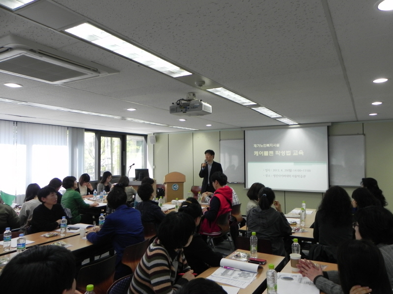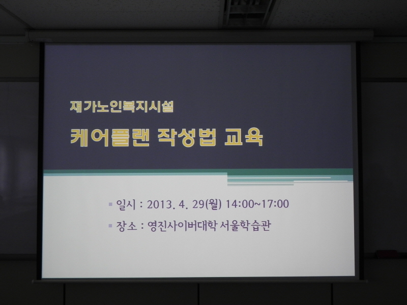 일시 : 2013. 4. 29(월) 14:00~17:00<BR>장소 : 영진사이버대학 서울학습관 대강당<BR>참석인원 : 66명<BR>내용 : 케어플랜 작성법