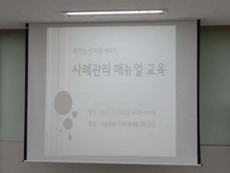 일시 : 2011. 7. 15(금) 14:00~18:00<BR>장소 : 서울특별시사회복지협의회 강당<BR>참석인원 : 41명<BR>내용 : 재가노인지원서비스 사례관리 매뉴얼 교육