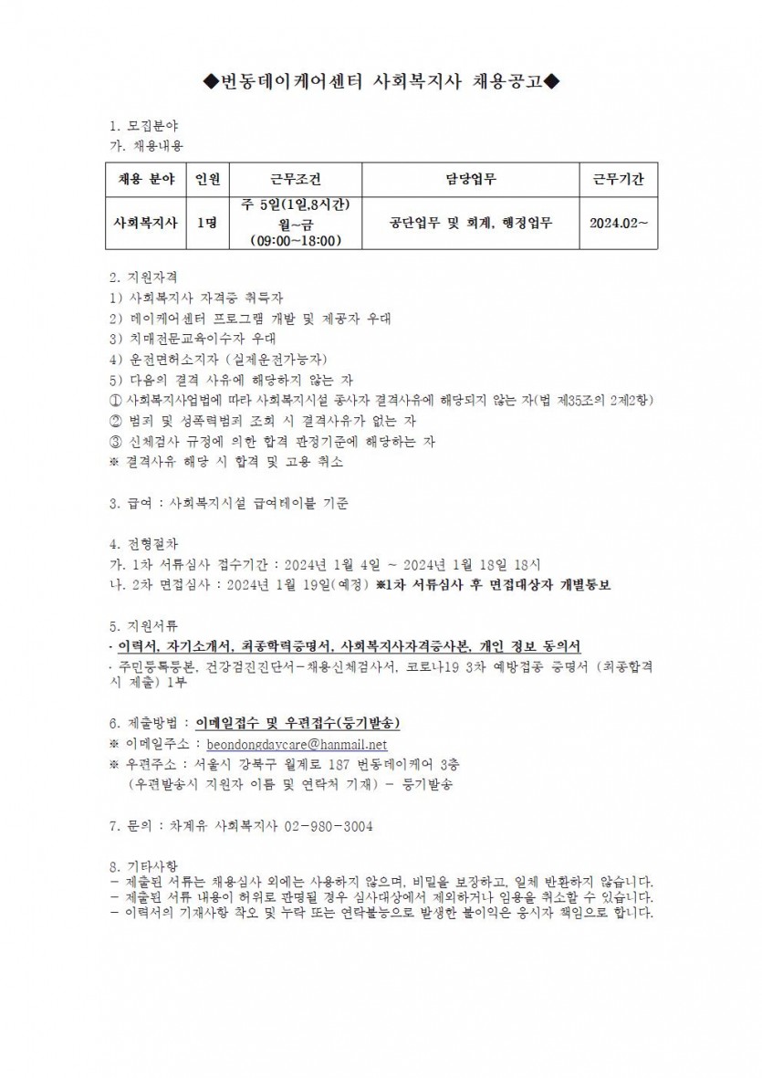 - 이전글상계동성당데이케어센터 사회복지사 채용 공고 24.01.22