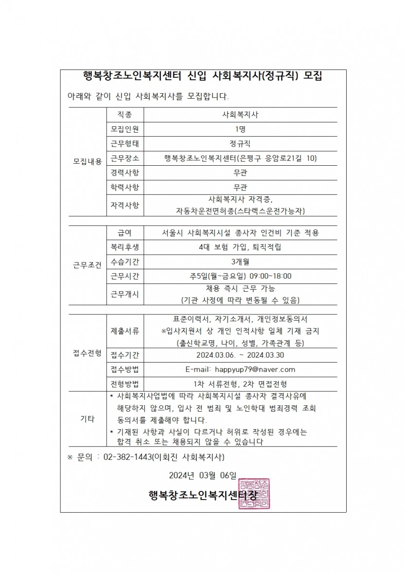 [채용공고] 주야간보호 신입 사회복지사(정규직) 채용 공고-20240306~20240330