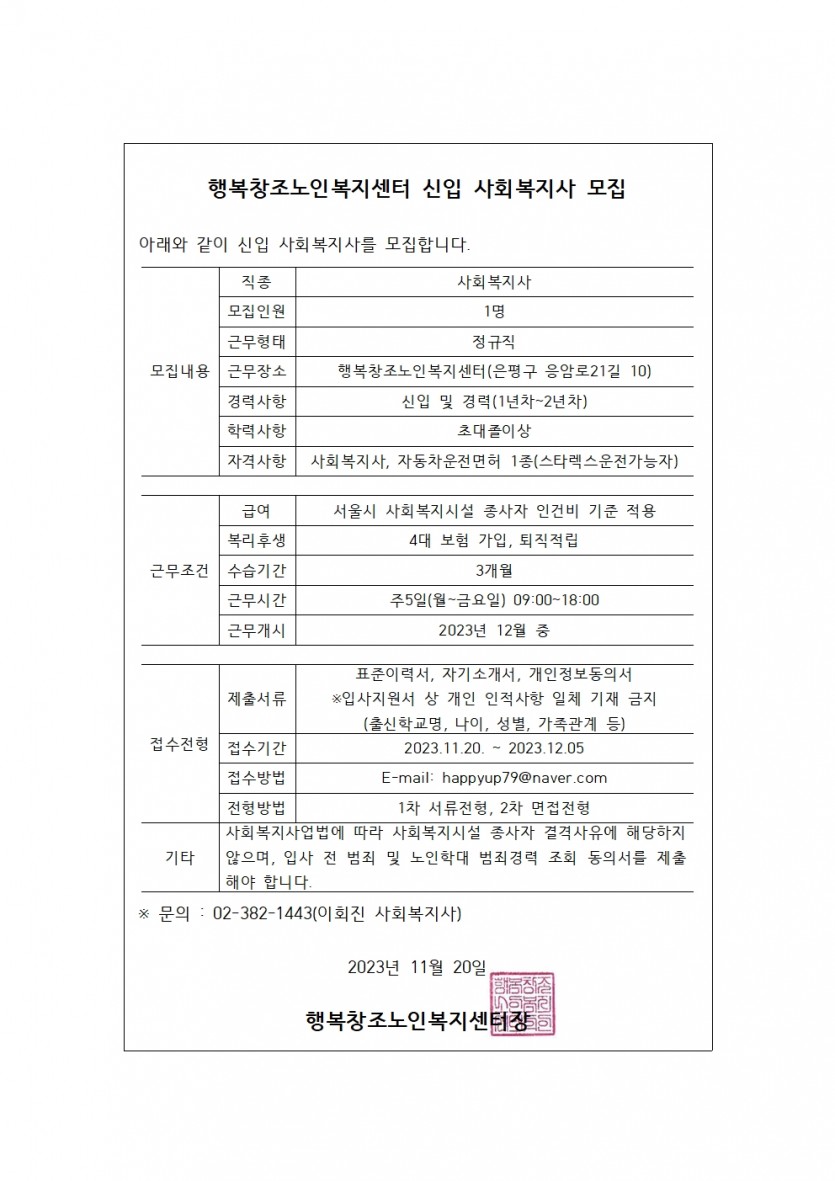 행복창조노인복지센터 사회복지사 모집(11/20~12/5)