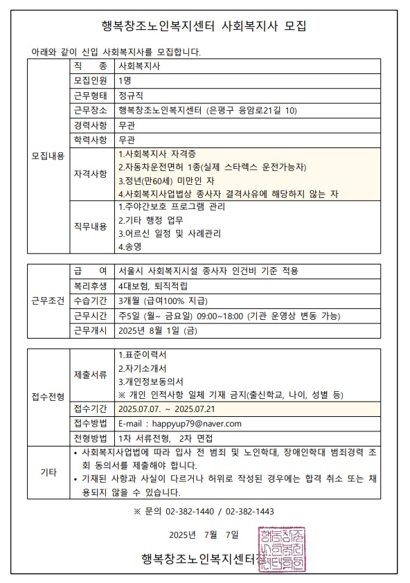 [행복창조노인복지센터]주야간보호 사회복지사 채용 공고