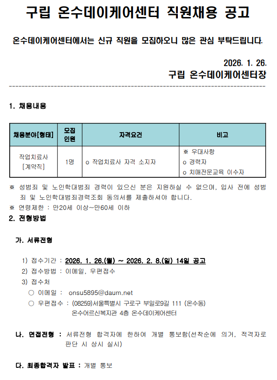구립온수데이케어센터 작업치료사 직원채용 공고