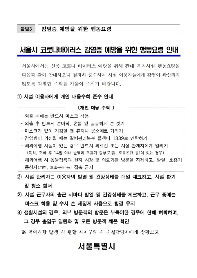 서울시에서는 신종 코로나 바이러스 예방을 위해 관내 복지시설 행동요령을 다음과 같이 안내하오니 철저히 준수하여 시설 이용자들에게 감염이 확산되지 않도록 각별한 주의를 기울여 주시기 바랍니다.