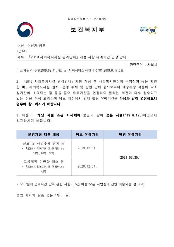 2019 사회복지시설 관리안내 개정 사항 유예기간 연장 안내