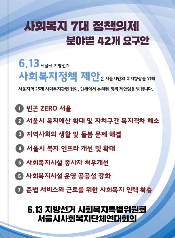 <P><SPAN style="FONT-SIZE: 16px">그 결과로 서울시장 후보자에게 제안할 사회복지 7대 정책의제와 분야별 42개 요구안을 발표하게 되었으며, 주요정당 서울시당과 서울시장 후보자 캠프에 전달할 예정입니다.</SPAN></P>