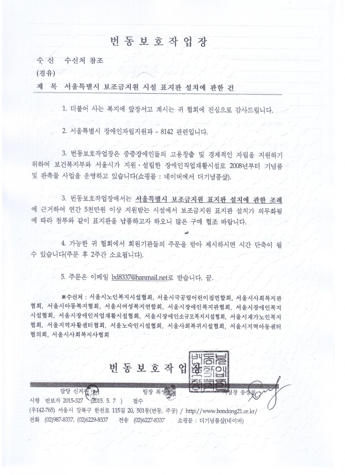 - 이전글번동보호작업장-서울특별시 보조금지원 시설 표지판 설치에 관한 건(2)-주문서 양식 15.05.08