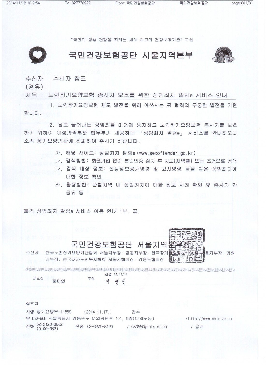 국민건강보험공단 서울지역본부-노인장기요양보험 종사자 보호를 위한 성범죄자 알림e 서비스 안내