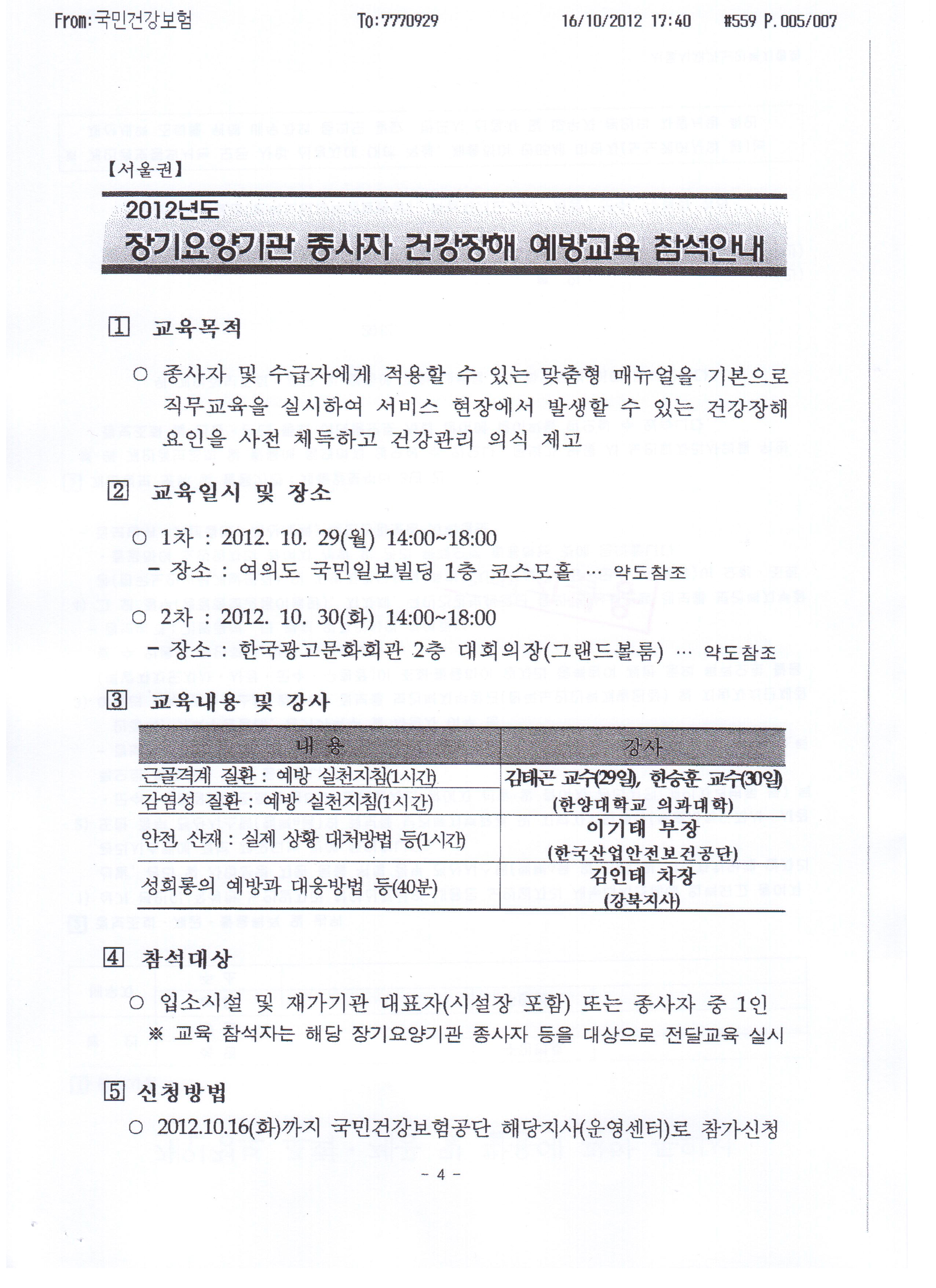 <P>국민건강보험공단에서는 장기요양기관 종사자의 건강관리 의식 제고를 위해 다음과 같이 <2012년도 장기요양기관 종사자 건강장해 예방교육>을 실시하니, 많이 참석하여 주시기 바랍니다.<BR><BR> 가. 목적<BR> - 서비스 현장에서 발생할 수 있는 건강장해 요인 사전 체득<BR> - 실제 상황 발생 시 수급자 보호 등 신속한 대처능력 연마<BR> 나. 교육일시 및 장소<BR> <서울권><BR> - 10.29(월) 14:00~18:00 여의도 국민일보빌딩 1층 코스모스홀<BR> - 10.30(화) 14:00~18:00 한국광고문화회관 2층 그랜드볼룸(대회의장)<BR> 다. 교육대상 : 입소시설 및 재가기관 대표자(시설장 포함) 또는 종사자 중 1인<BR> 라. 주요 교육내용 : 근골격계 질환, 감염성 질환, 안전 및 산재, 성희롱 예방<BR><BR>붙임 : 교육안내문 3부. 끝.</P>