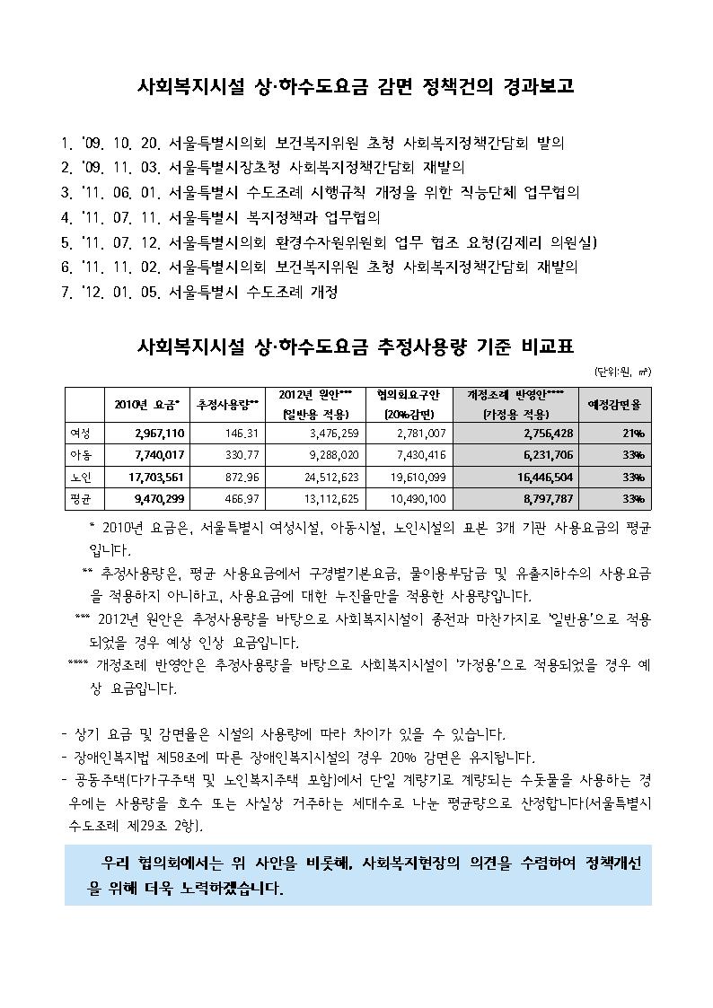 <P class=바탕글><SPAN style="FONT-FAMILY: HY신문명조; FONT-SIZE: 12pt; mso-fareast-font-family: HY신문명조; mso-hansi-font-family: HY신문명조" lang=EN-US><FONT size=2 face=Arial>서울특별시사회복지협의회에서는 지난 2011년 7월, 장애인복지시설에만 감면혜택이 주어지는 서울특별시의 상·하수도 요금과 관련하여 이를 사회복지시설 전체로 확대할 것을 요구하는 정책건의서를 통해 서울특별시와 서울특별시의회 환경수자원위원회에 요구한 바 있습니다.</FONT></SPAN></P>