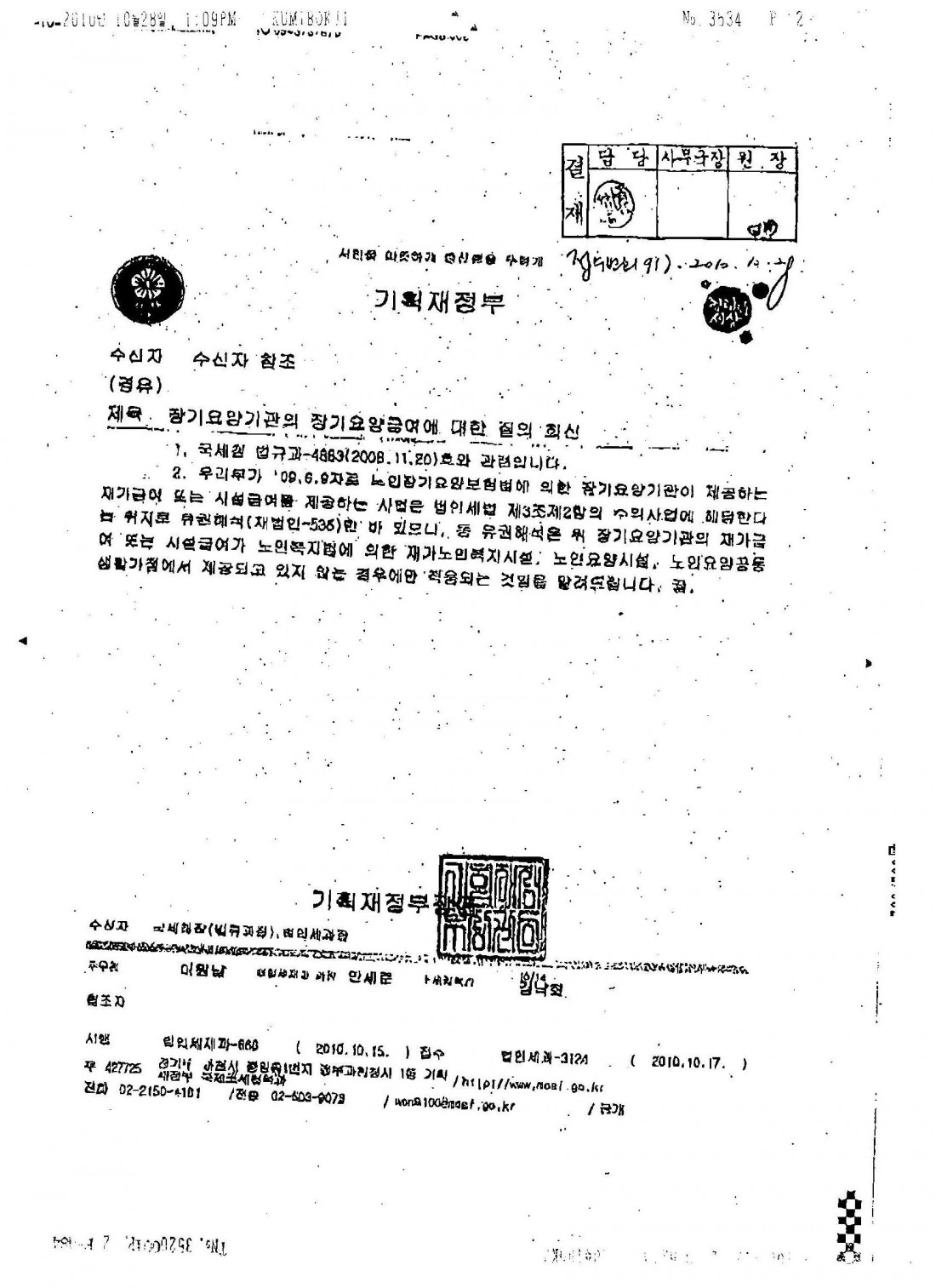 <P>1. 기획재정부에서는 2009년 6.9일자로 노인장기요양보험법에 의한 장기요양기관이 제공하는 재가급여 또는 시설급여를 제공하는 사업은 법인세법 제3조 2항 의 수익사업에 해당한다는 취지로 유권해석을 한 바 있습니다.</P>